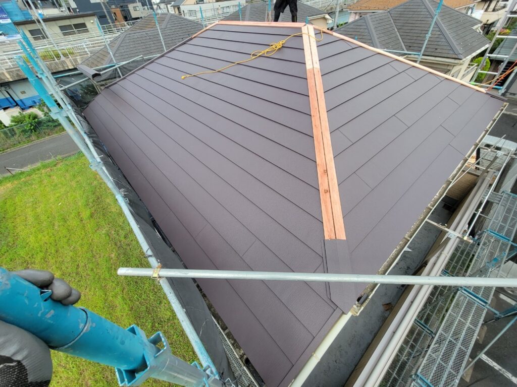 新しい屋根材を葺き、棟板金を取り付けるための貫板や防水面戸を設置します。