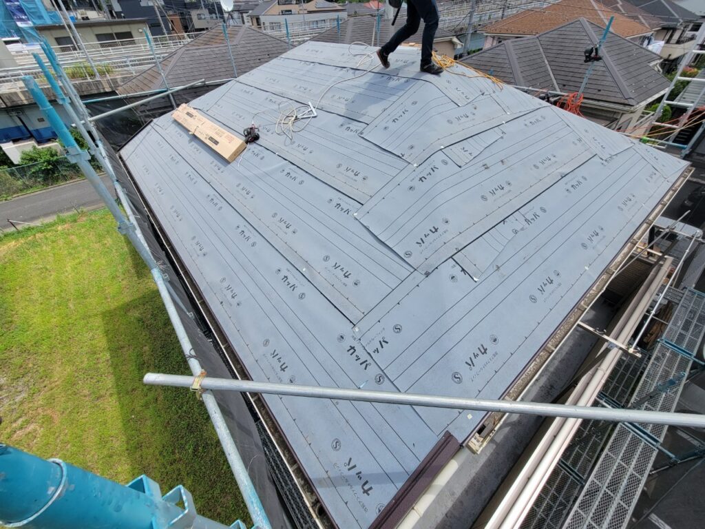 ↓既存の屋根材の上から防水シートを張っていきます。