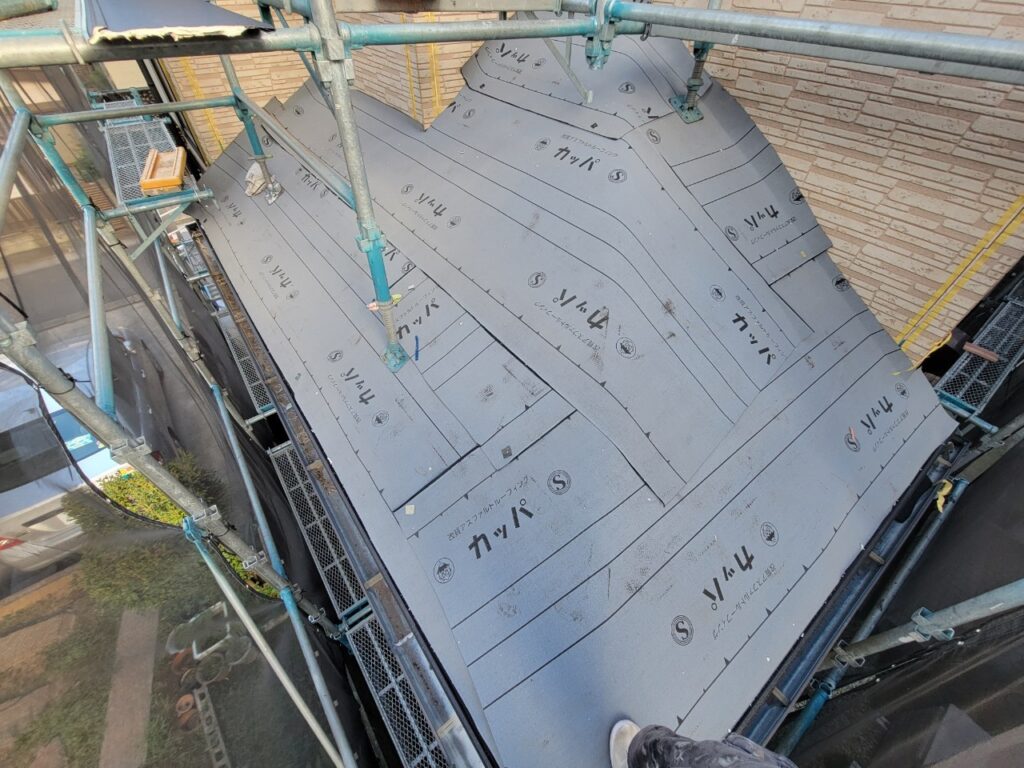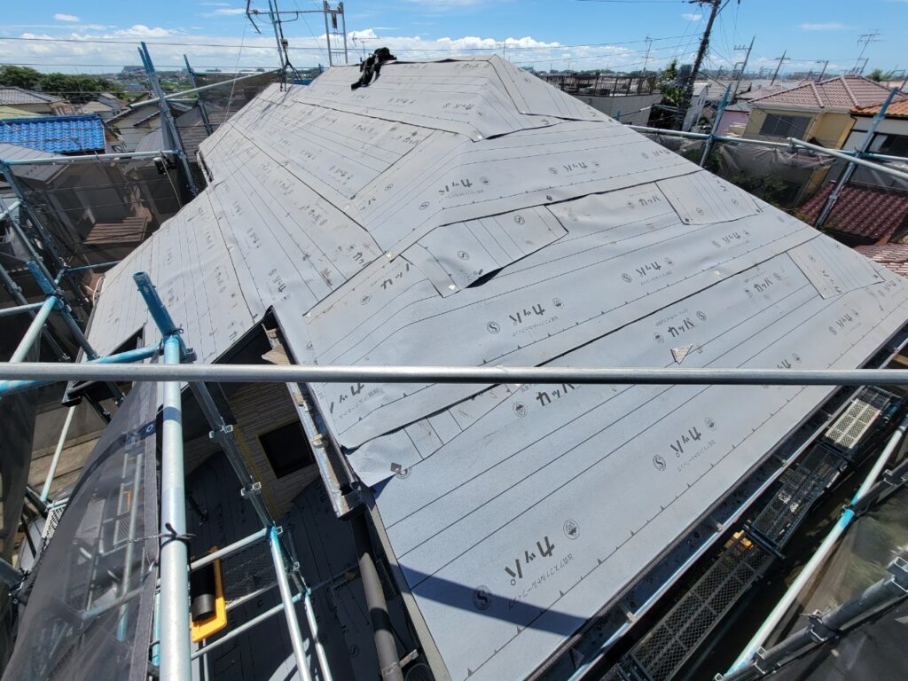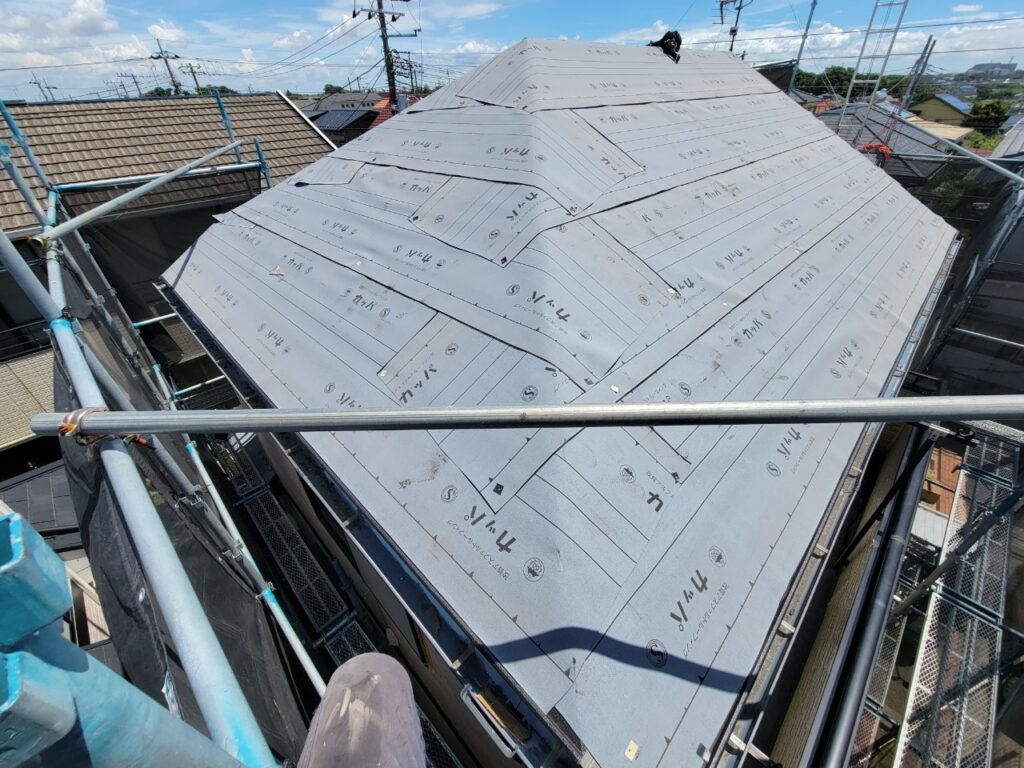 ↓今回は屋根カバー工事ですので、既設屋根材の上から防水シートを張ります。
