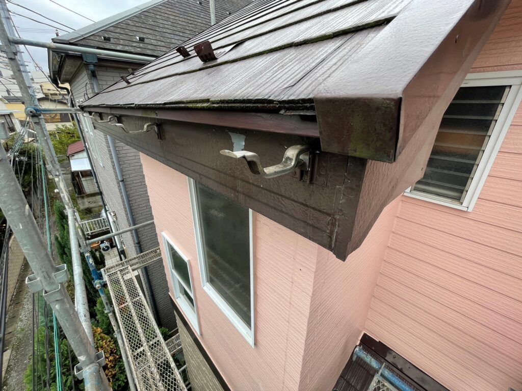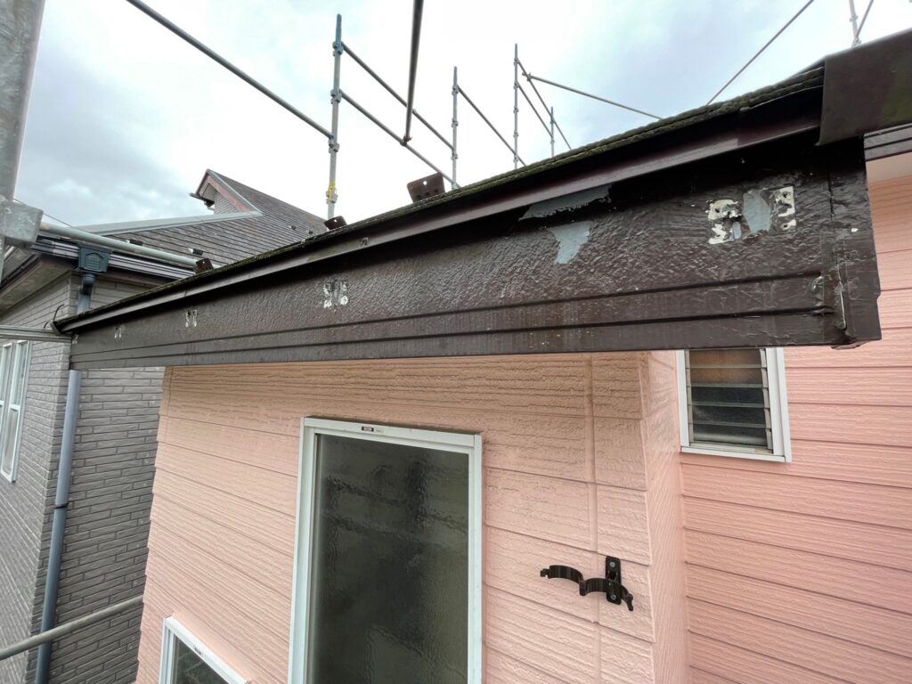 ↑既存の雨樋や、でんでんと呼ばれる雨樋取り付け金具をすべて撤去した状態です。