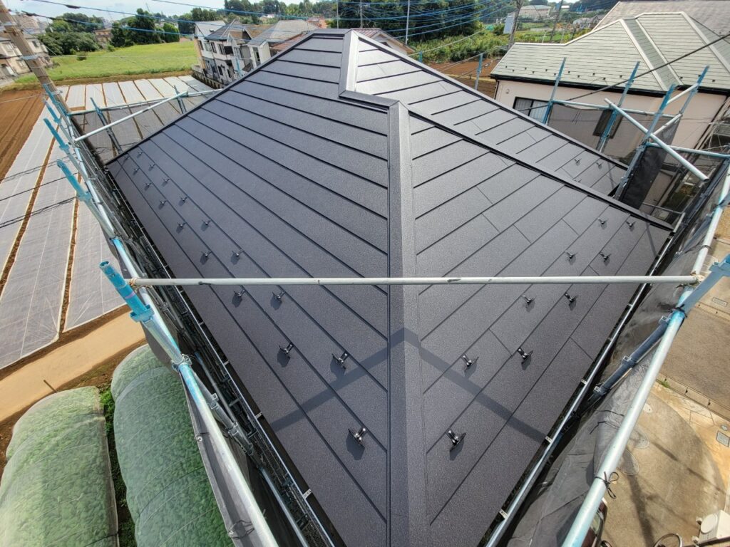 新しい屋根材のメタリックなブラックが日差しに映え、より一層素敵に見えます♪