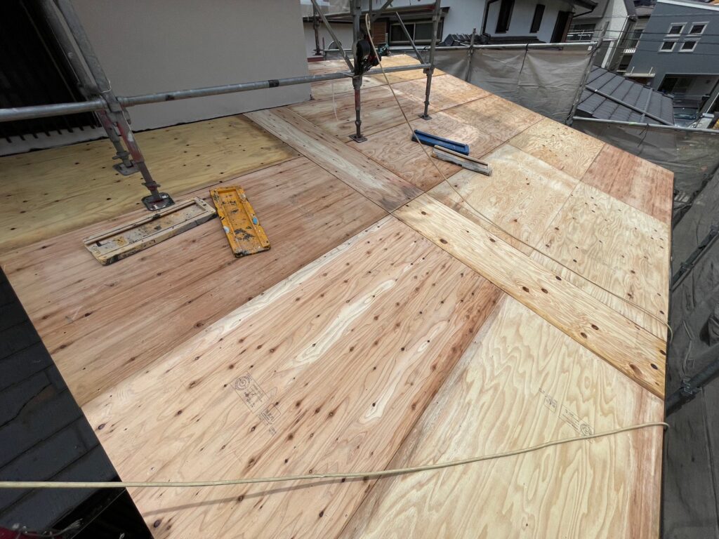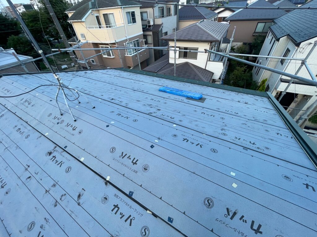下屋根は野地板の上から、大屋根部分は既設屋根材の上から防水シートを張ります。