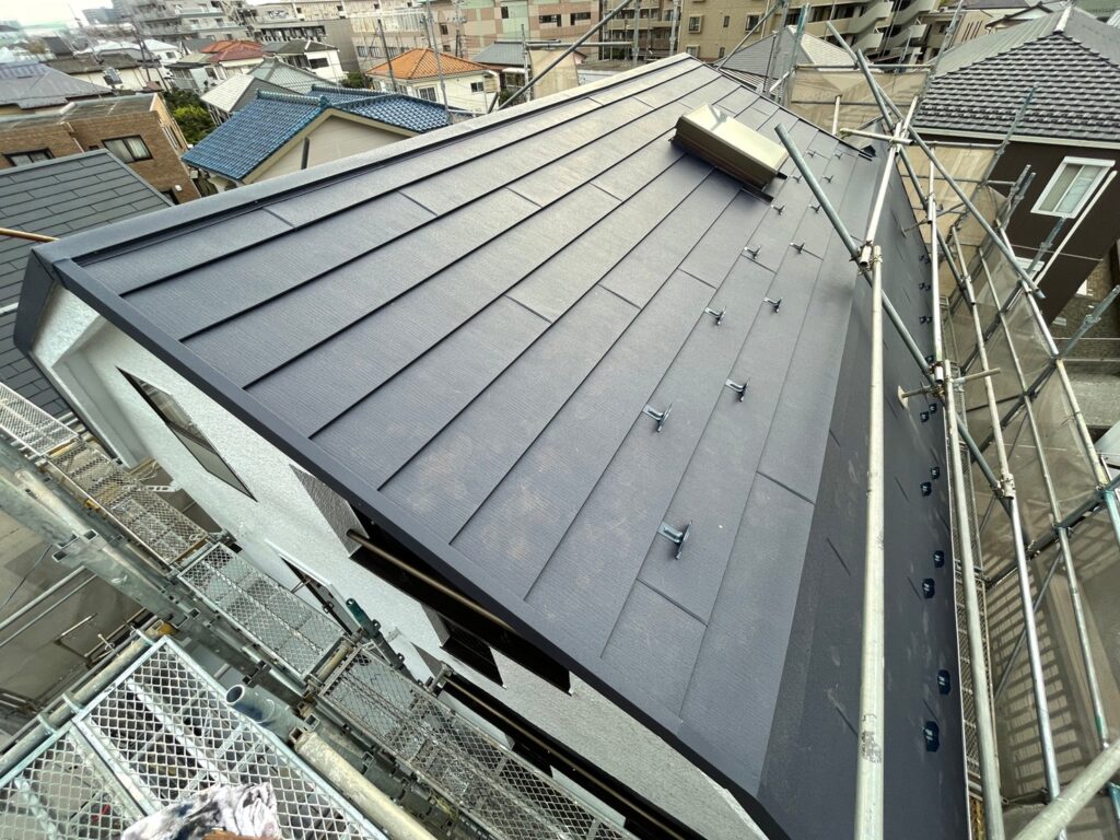 今回使用したガルテクトという屋根材は嵌め合わせて葺くことにより風に強く、耐久性に優れています。