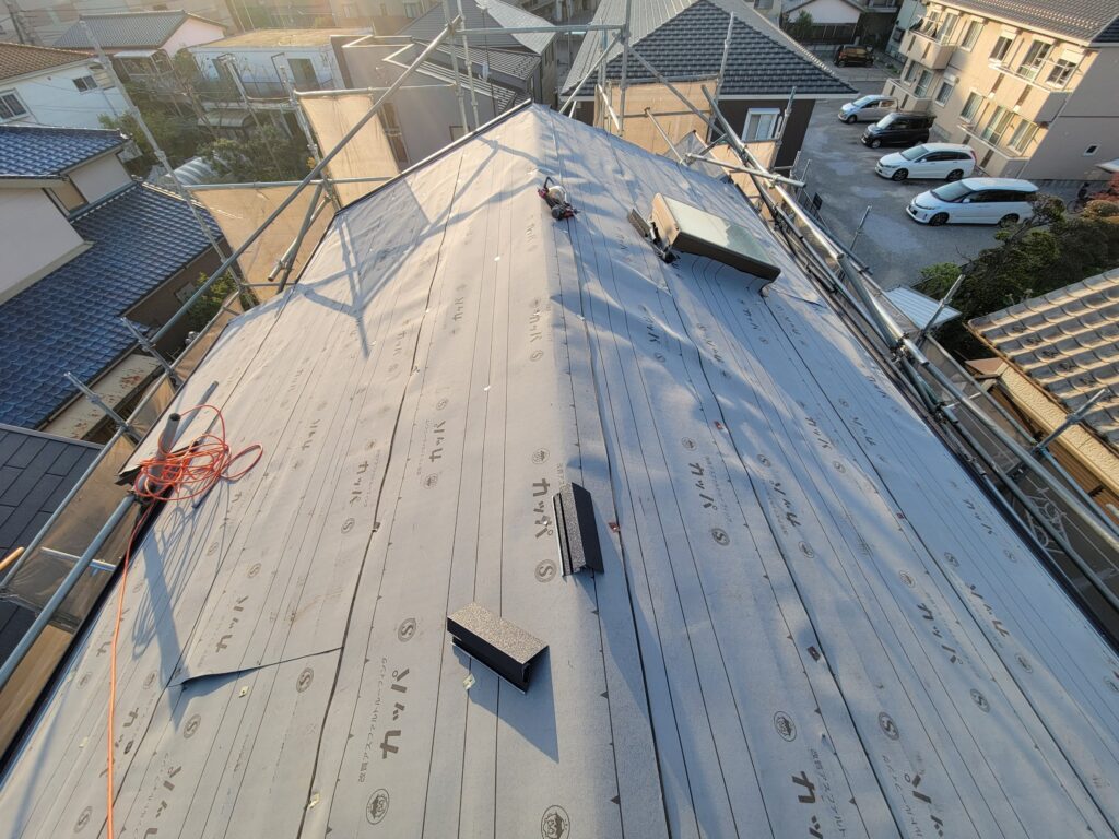防水シート(弊社は改質アスファルトルーフィングをスタンダードで使用)を丁寧に貼っていきます。
