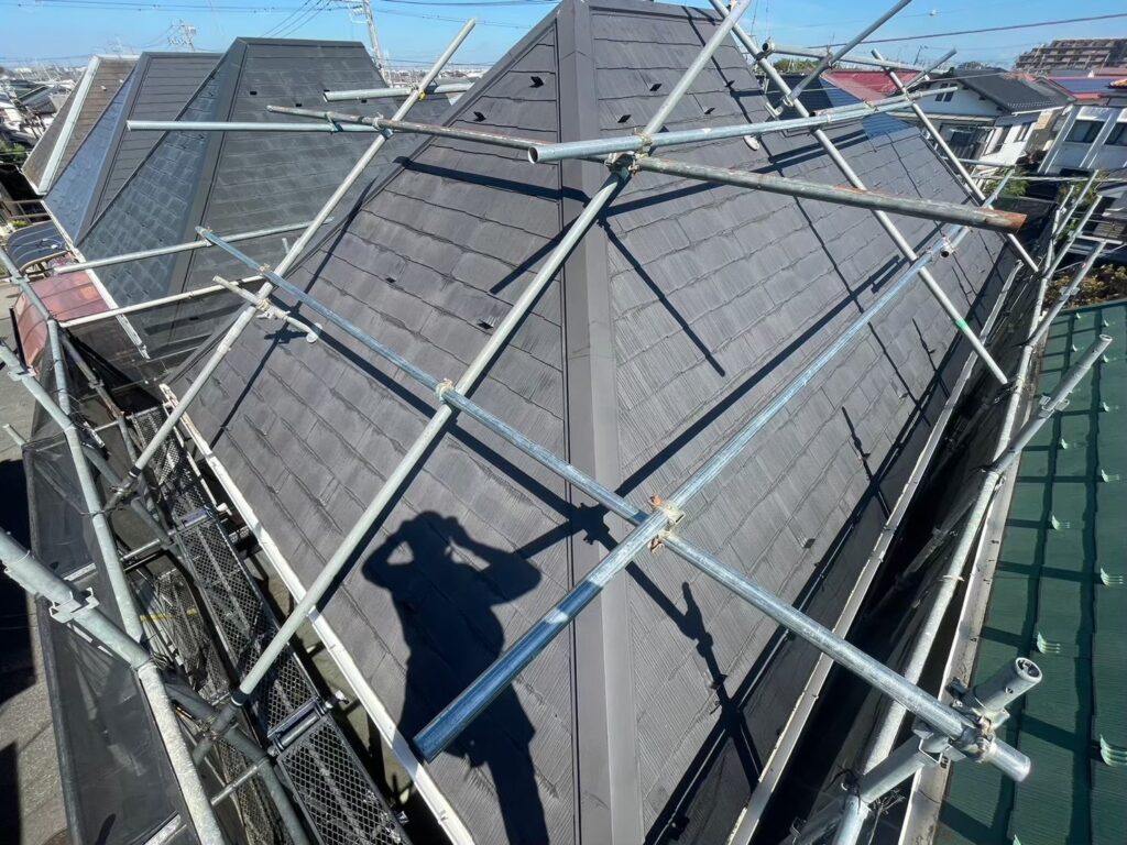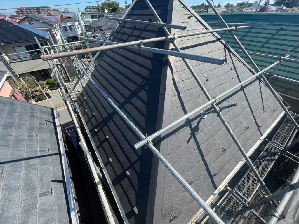 今回の屋根は『急勾配』と呼ばれる傾斜度の高い造りのため、このように屋根部分まで足場設置が必要となります。