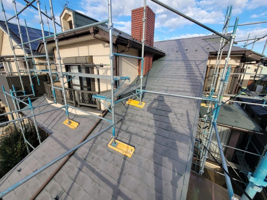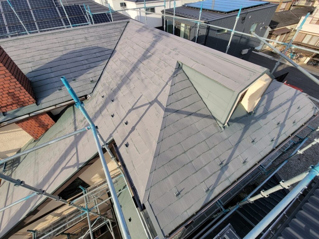 影になる部分にうっすらと苔が生えていたり、色褪せているところがありますね。 beforeではスレートと呼ばれる屋根材が使用されています。