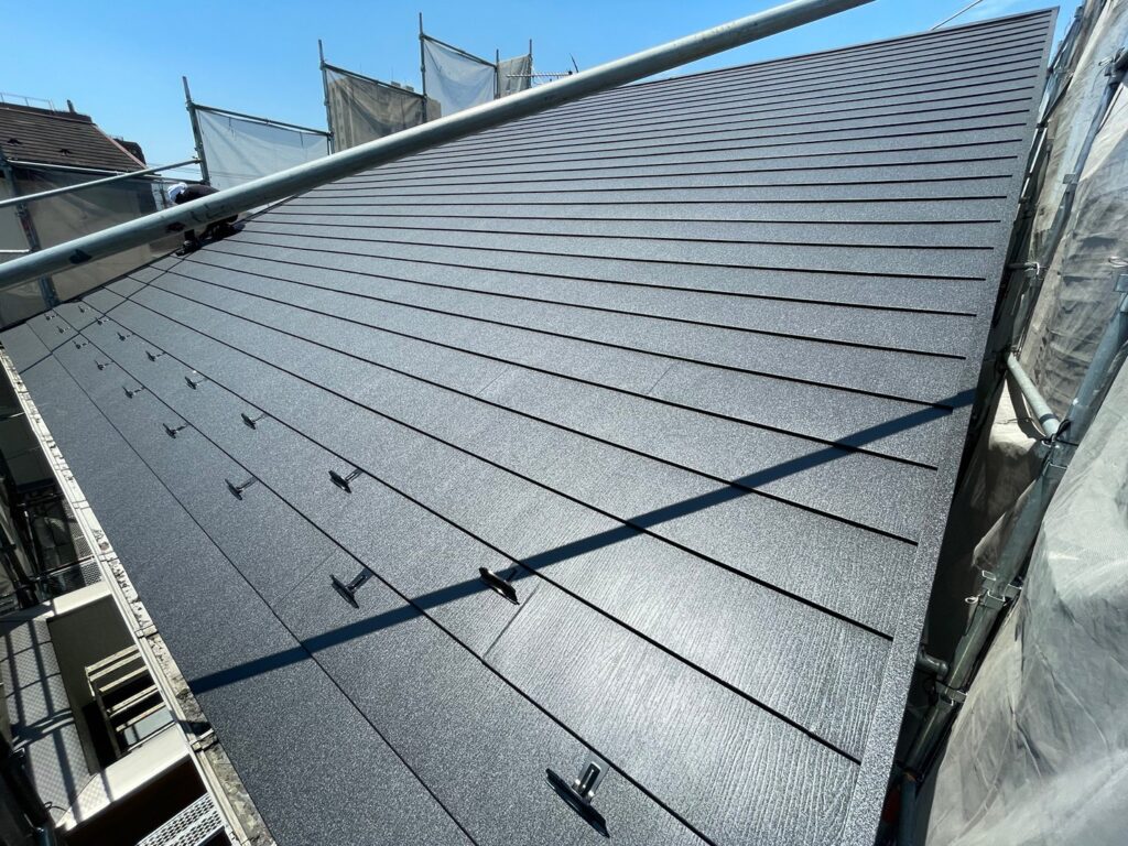 色合いもガラリと変わり、メタリックなブラックの色味がとてもかっこいい印象の屋根になりました☆
