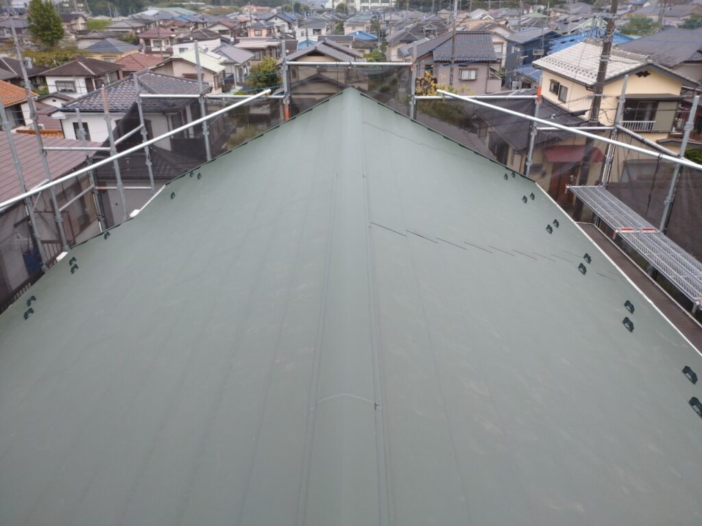 今回使用した横暖ルーフという屋根材は嵌め合わせて葺くことにより風に強く、耐久性に優れています。
