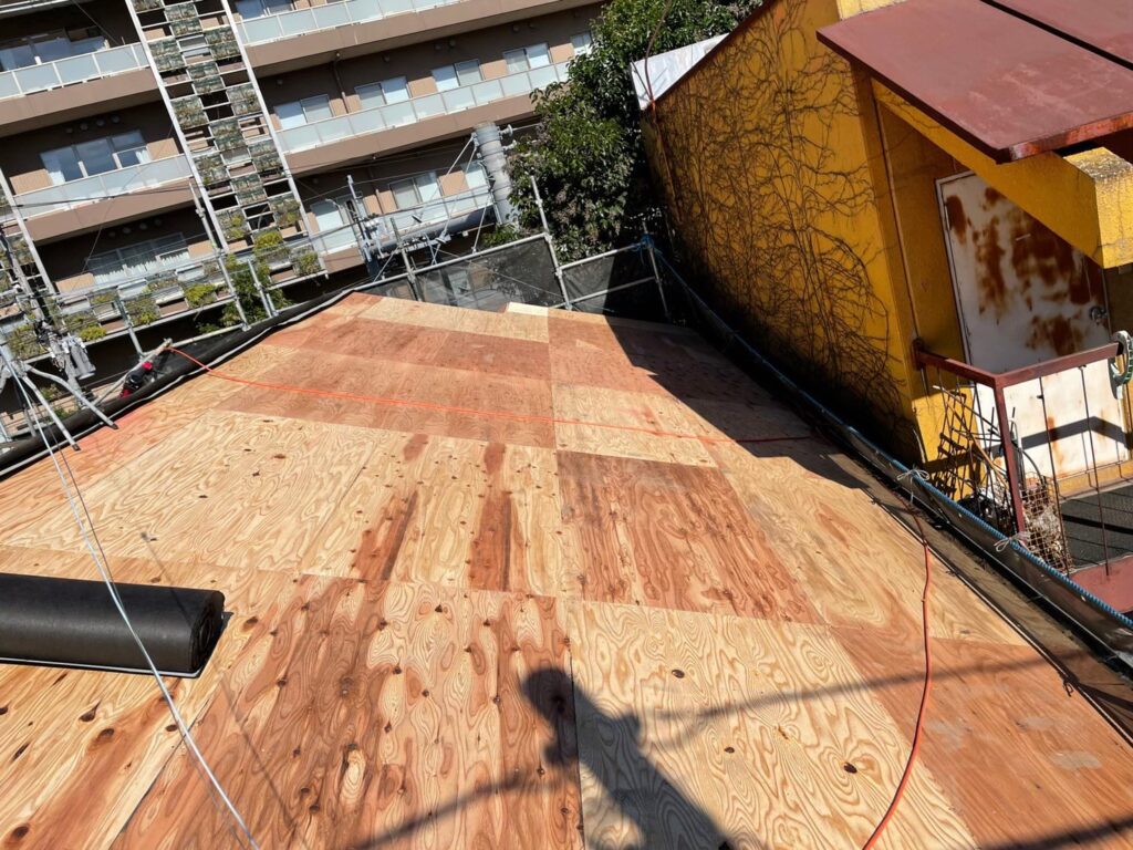 下地となる野地板、その上に防水シートを張っていきます。