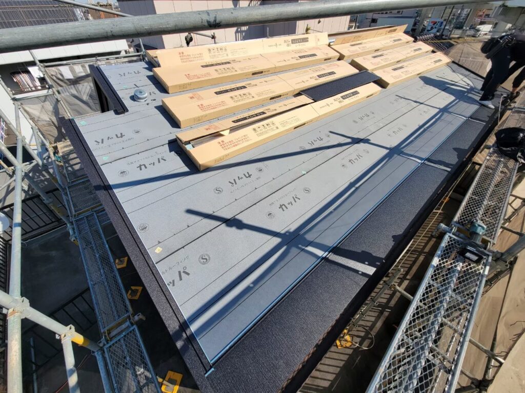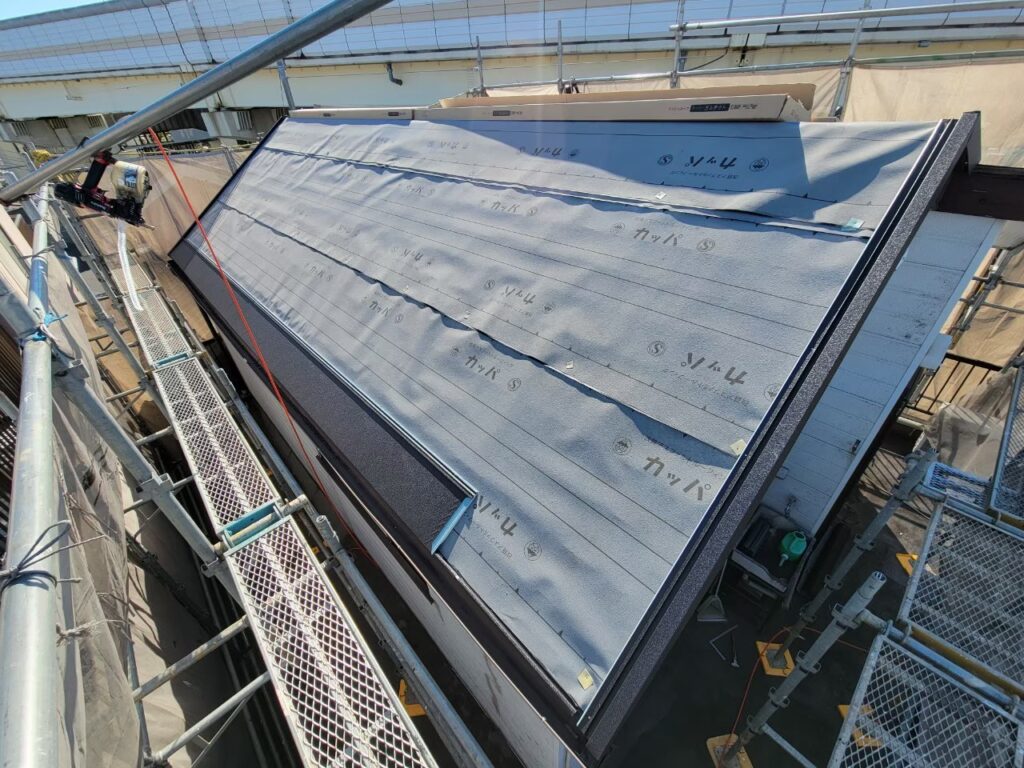 ↑既設屋根材の上から防水シートを張り、新しい屋根材を葺いていきます。