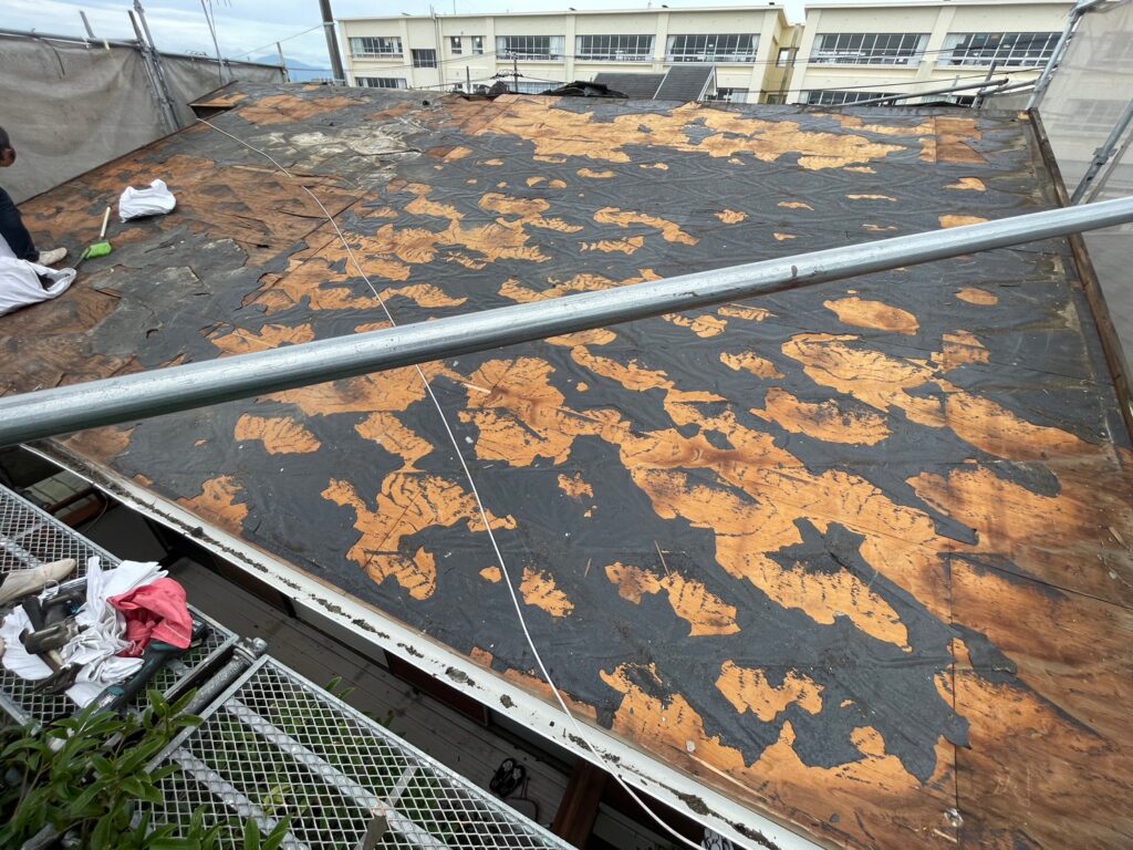 屋根の葺き替えとは。。既存の屋根を解体・撤去し、新しく張り替えることです。屋根材だけでなく、野地板や防水シートといった下地も新しくなるため新築時と同等の防水性の回復が期待できます。既設の屋根材を撤去し