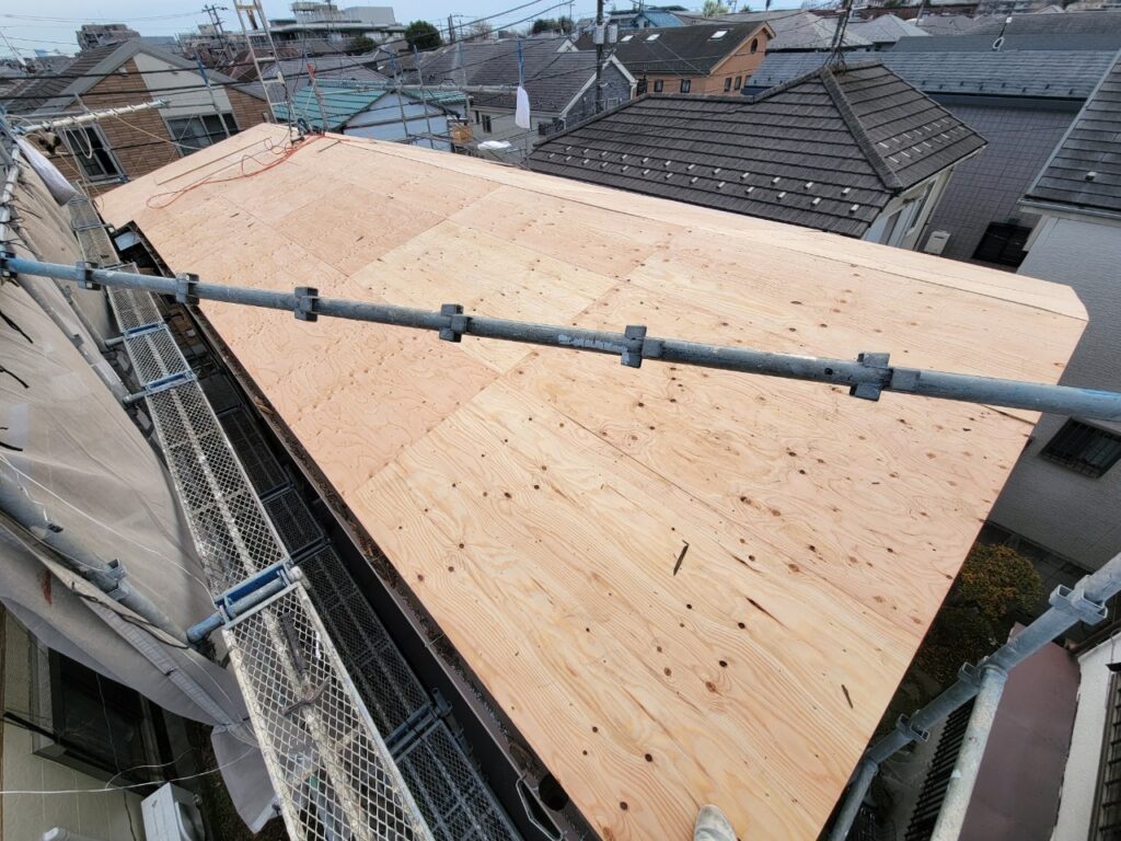 屋根の葺き替えとは。。既存の屋根を解体・撤去し、新しく張り替えることです。屋根材だけでなく、野地板や防水シートといった下地も新しくなるため新築時と同等の防水性の回復が期待できます。↓下地となる野地板を